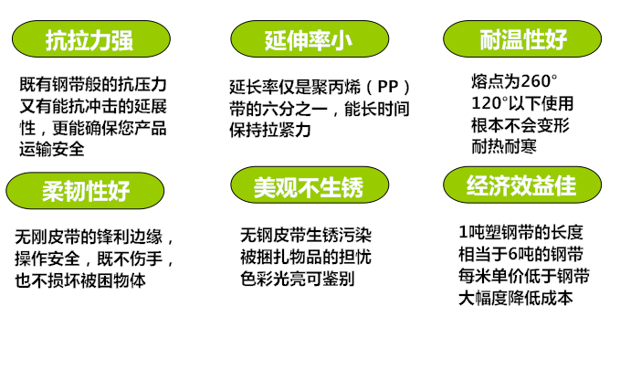 | 性能/產(chǎn)品 | PET塑鋼帶 | 鋼帶 | PP打包帶 |